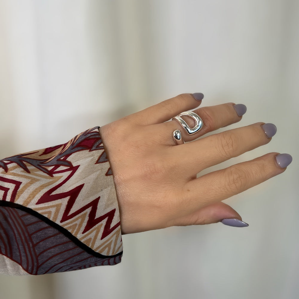Ένα ασημένιο δαχτυλίδι σε ντελικάτο σχέδιο με μοντέρνο σχεδιασμό. Συνδυάζει την φινέτσα με την διαχρονικότητα του ασημιού. Συνδυάζεται και με άλλα κοσμήματα.