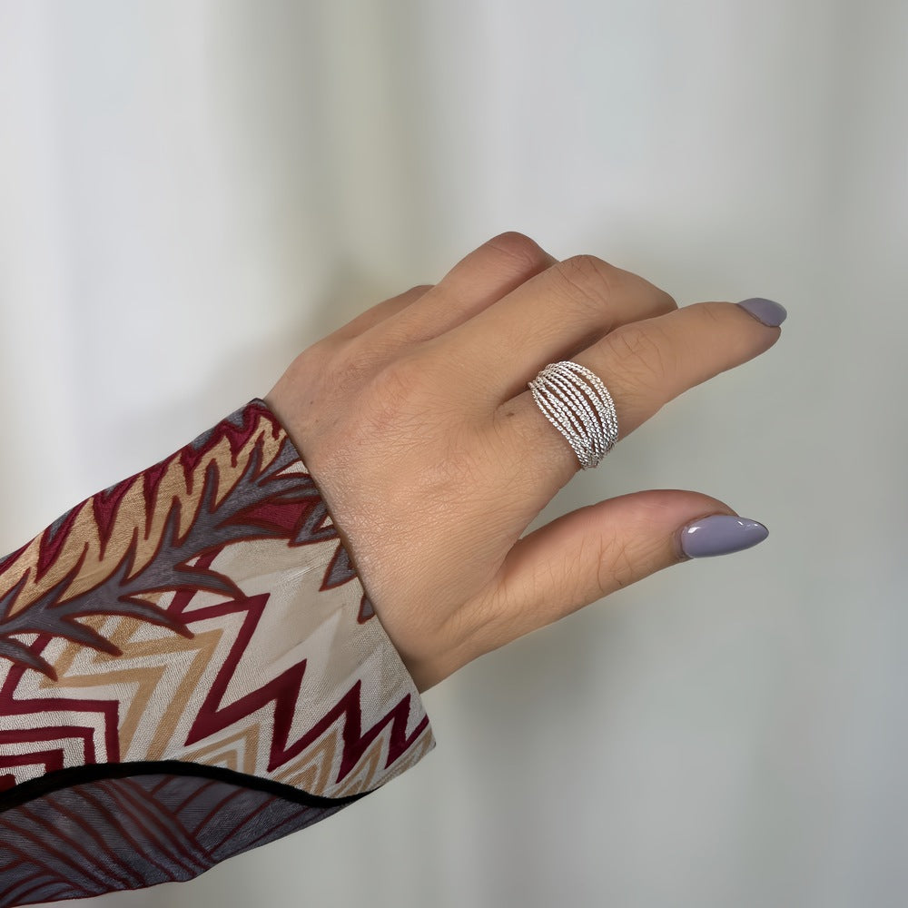 Ένα ασημένιο δαχτυλίδι σε ντελικάτο σχέδιο με μοντέρνο σχεδιασμό. Συνδυάζει την φινέτσα με την διαχρονικότητα του ασημιού. Συνδυάζεται και με άλλα κοσμήματα.