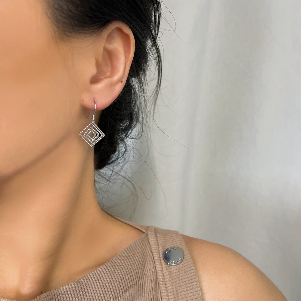Κρεμαστά ασημένια σκουλαρίκια σε σχήμα ρόμβου. Το μεγεθός τους είναι διακριτικό και φοριούνται άνετα από το πρωί εώς το βράδυ.