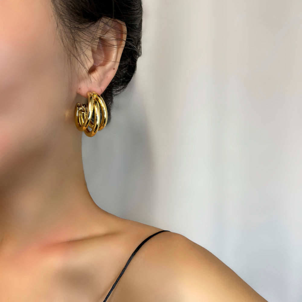 Ατσάλινα σκουλαρίκια επιχρυσωμένα, σε σχέδιο τριπλών κρίκων που αναδεικνύει την εμφάνισή σας. Μπορεί να συνδυαστεί με άλλα σκουλαρίκια για δυνατά ear combo.
