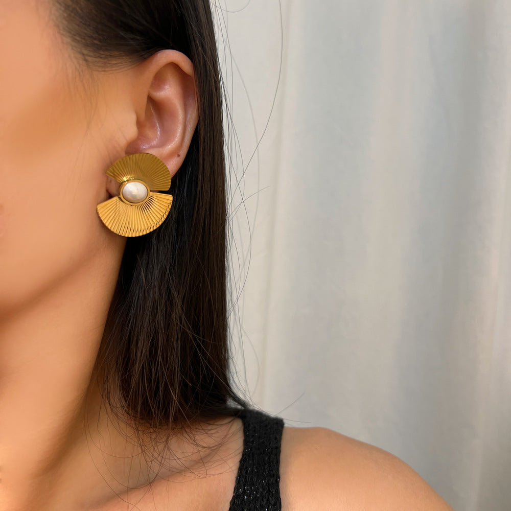 Κατασκευασμένο από ανοξείδωτο ατσάλι επιχρυσωμένο 18Κ, ένα εντυπωσιακό κόσμημα με μαργαριτάρι. Ένα κομψό ζευγάρι σκουλαρίκια σε σχήμα βεντάλιας που θα τελειοποιήσει το στυλ σας.