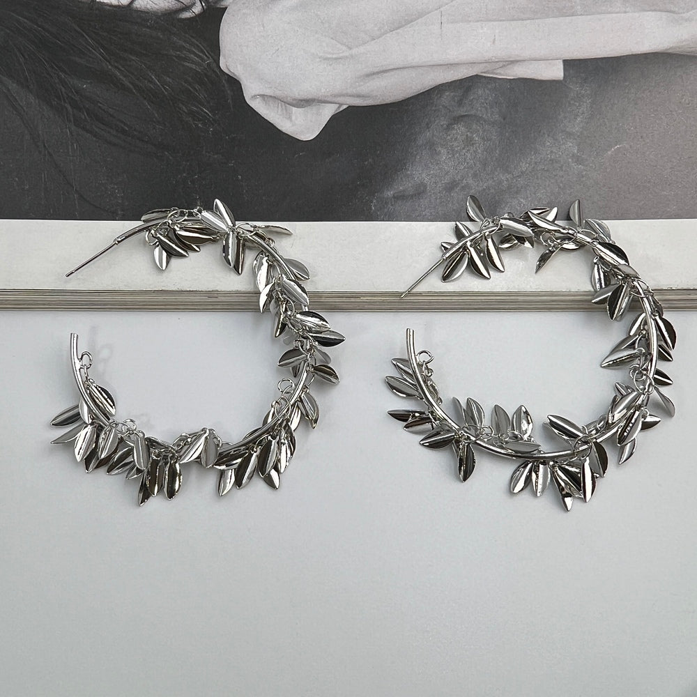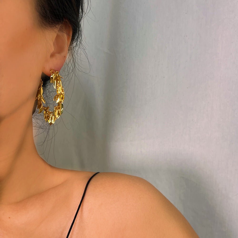 Κατασκευασμένο από ανοξείδωτο ατσάλι επιχρυσωμένο 18Κ, ένα εντυπωσιακό ζευγάρι κρίκων διακοσμημένο με φύλλα που του δίνουν extra κίνηση. Ένα κομψό ζευγάρι σκουλαρίκια σε ασημί ή χρυσό χρώμα που θα απογειώσει το στυλ σας.