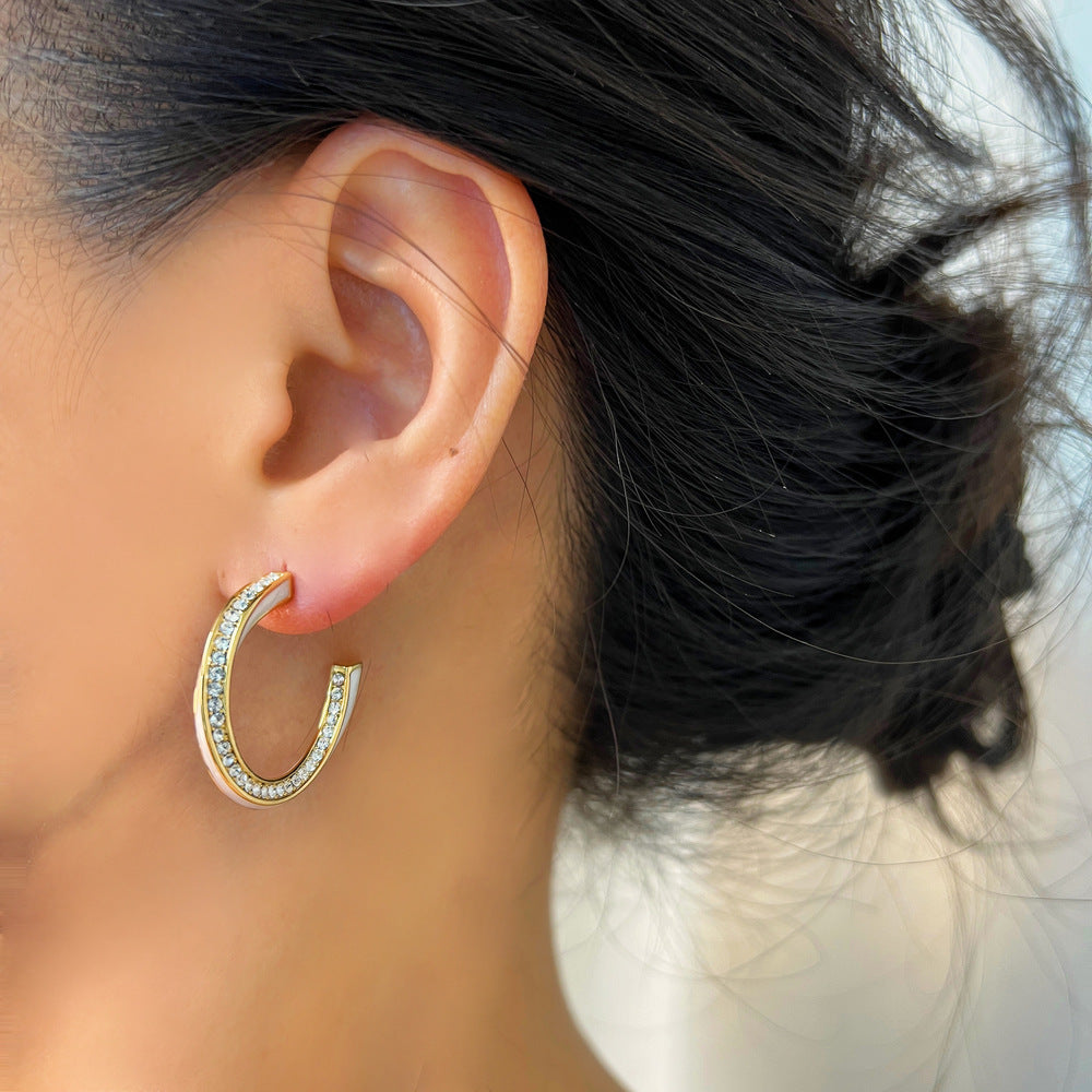 Εντυπωσιακοί κρίκοι με σμάλτο και ζιργκόν. Είναι κατασκευασμένοι απο ανοξείδωτο ατσάλι επιχρυσωμένο. Πανέμορφο ζευγάρι σκουλαρίκια που μπορεί να φορεθεί όλες τις ώρες και να αναδείξει αρμονικά το outfit σας.