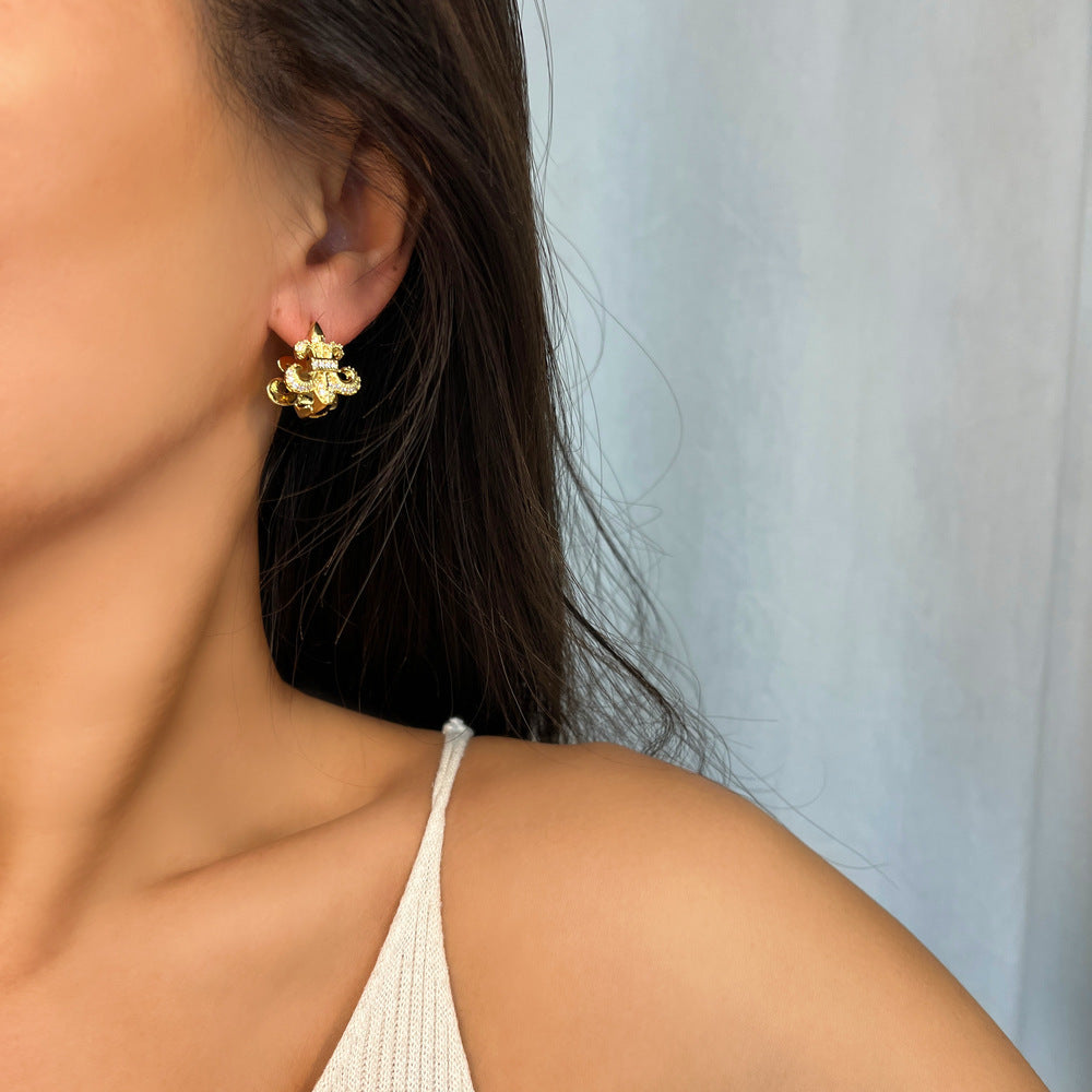 Ιδιαίτερο ζευγάρι σκουλαρίκια κατασκευασμένο από ανοξείδωτο ατσάλι επιχρυσωμένο με ζιργκόν να του δίνουν λάμψη. Ένα ιδιαίτερο ζευγάρι σκουλαρίκια που θα απογειώσει το στυλ σας.