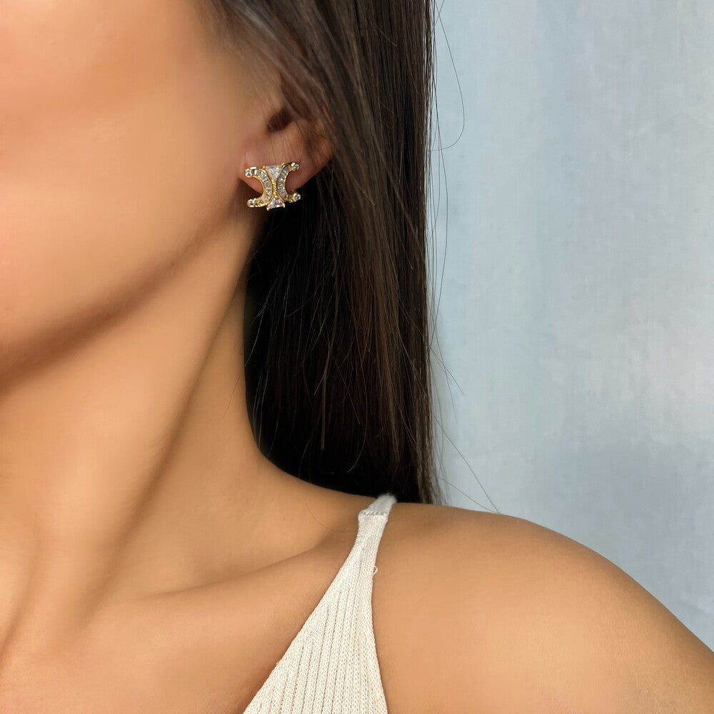 Ιδιαίτερο κουμπτωτό ζευγάρι, κατασκευασμένο από ανοξείδωτο ατσάλι επιχρυσωμένο με ζιργκόν. Ένα ζευγάρι σκουλαρίκια που θα απογειώσει το στυλ σας.