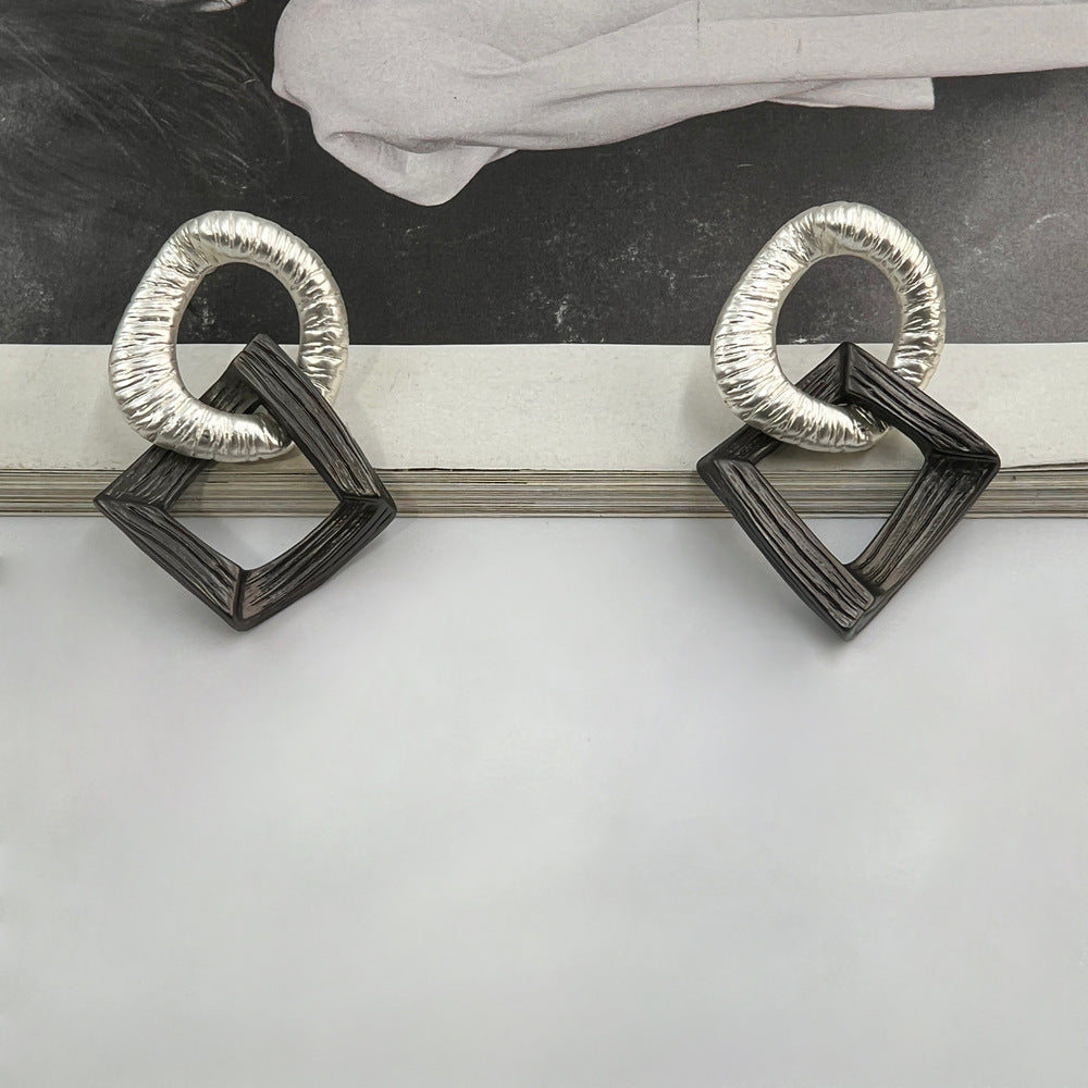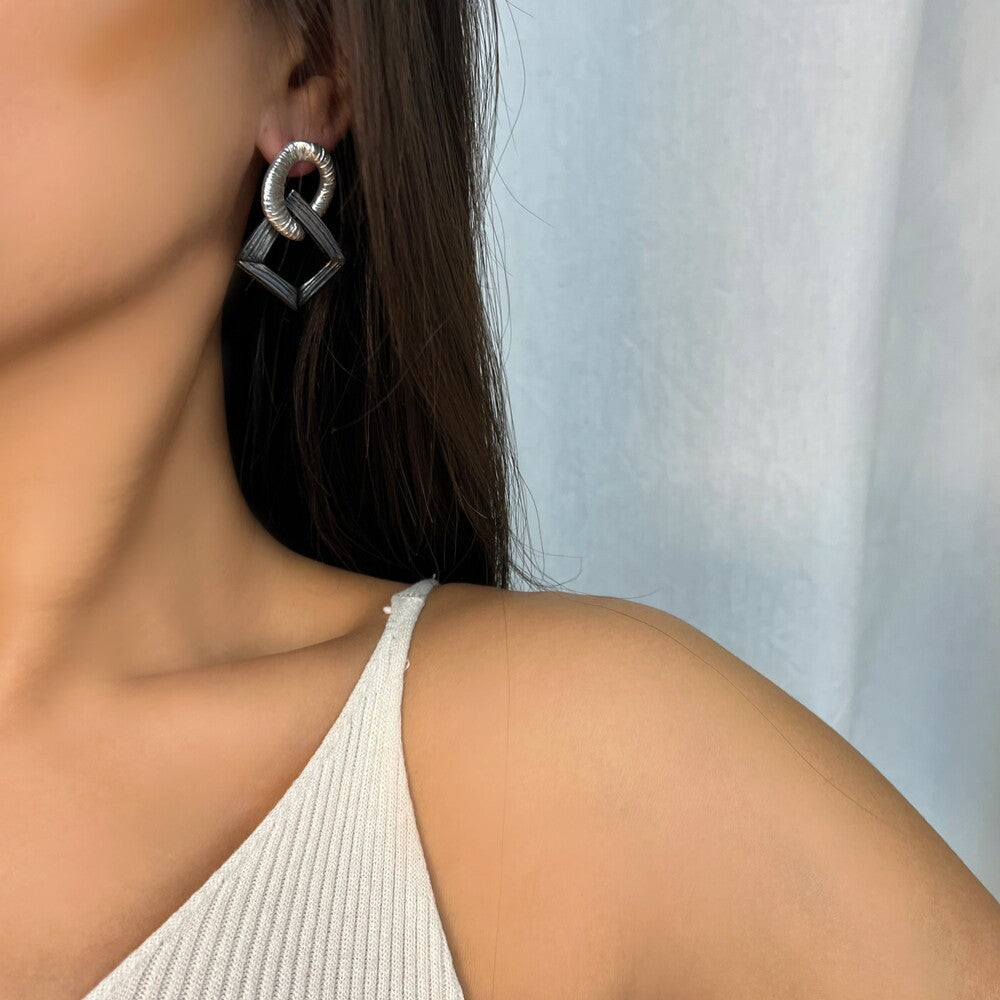 Ιδιαίτερο ζευγάρι σκουλαρίκια σε ασημί και μαύρο χρώμα. Εξαιρετικό σχέδιο κατασκευασμένο από ανοξείδωτο ατσάλι επιχρυσωμένο. Ένα όμορφο ζευγάρι σκουλαρίκια που θα απογειώσει το στυλ σας.