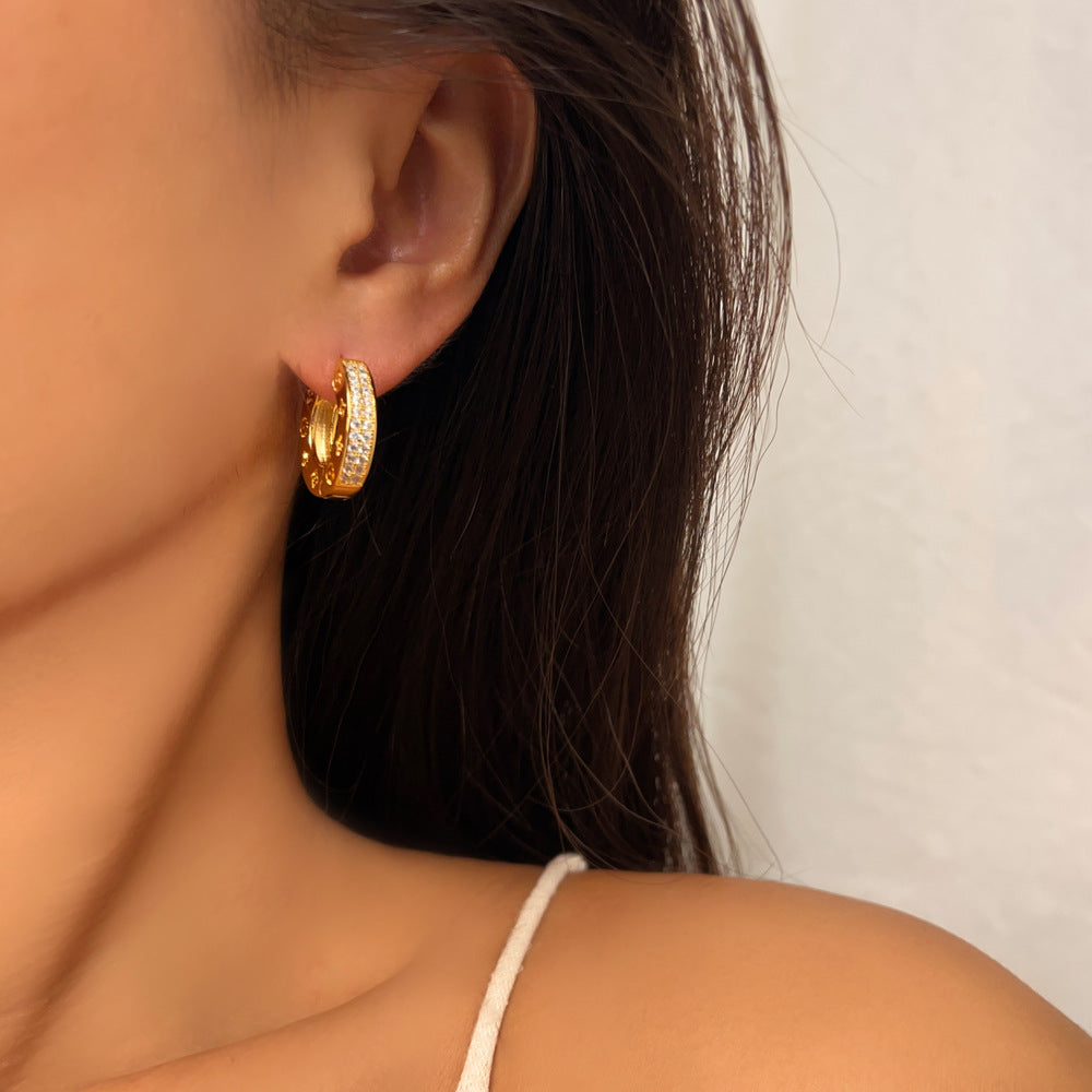 Κρίκοι σε ιδιαίτερο σχέδιο. Φοριούνται άνετα καθ' όλη τη διαρκεια της μέρας λόγω του διακριτικού τους σχεδίου, είναι κατασκευασμένοι από ανοξείδωτο ατσάλι επιχρυσωμένο. Ένα ζευγάρι σκουλαρίκια που αναδεικνύει το στυλ μας.