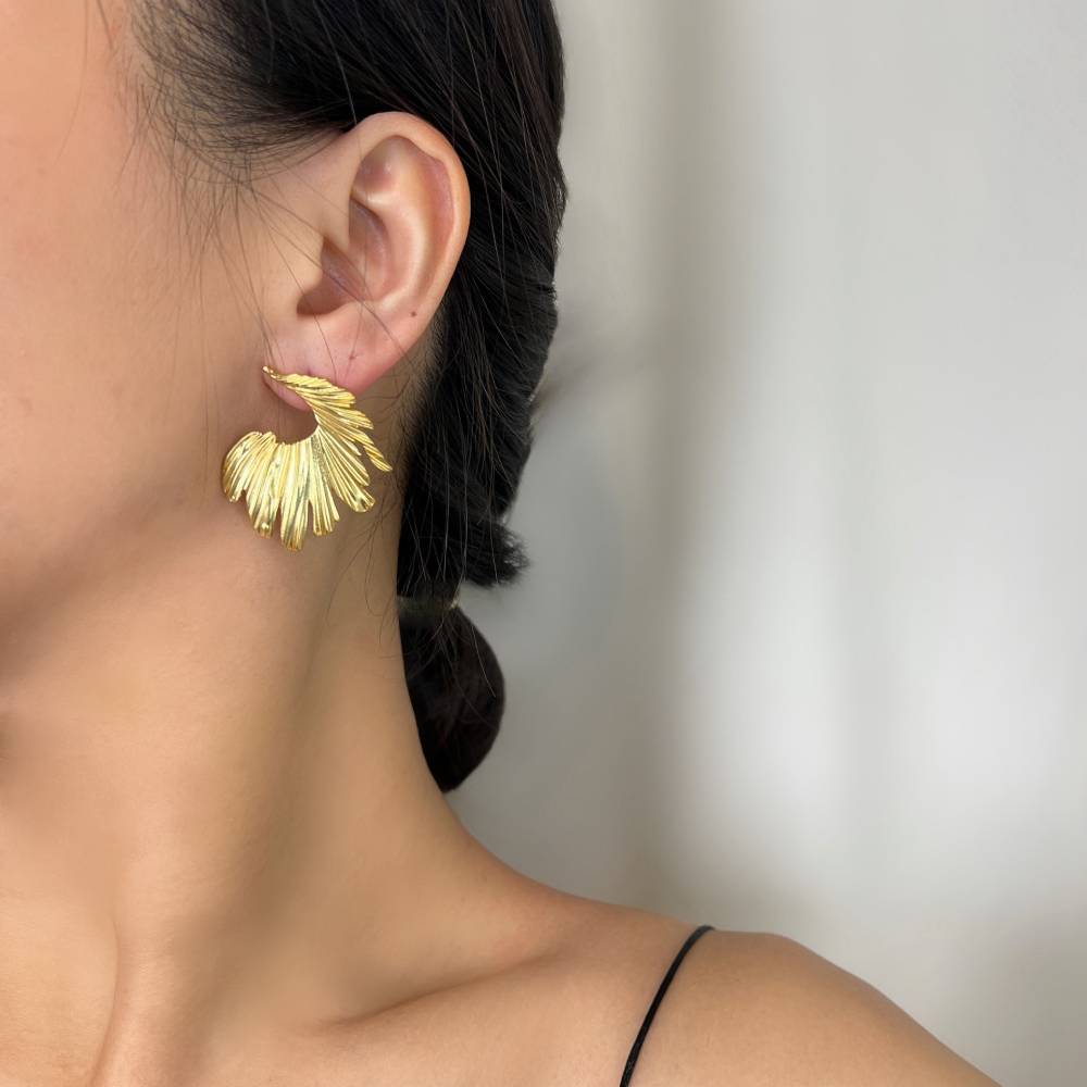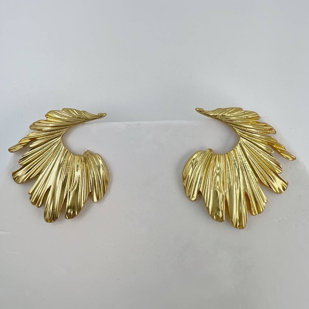 Εξαιρετικό ζευγάρι κρεμαστά σκουλαρίκια από ανοξείδωτο ατσάλι επιχρυσωμένο με 18Κ. Ένα εντυπωσιακό ζευγάρι σκουλαρίκια με περίτεχνο και ιδιαίτερο σχέδιο σε σχήμα φύλλου, τραβάει τα βλέμματα και σας κάνει αν ξεχωρίζετε. Ταιριάζει με πολλά outfit από το πρωί ως το βράδυ.