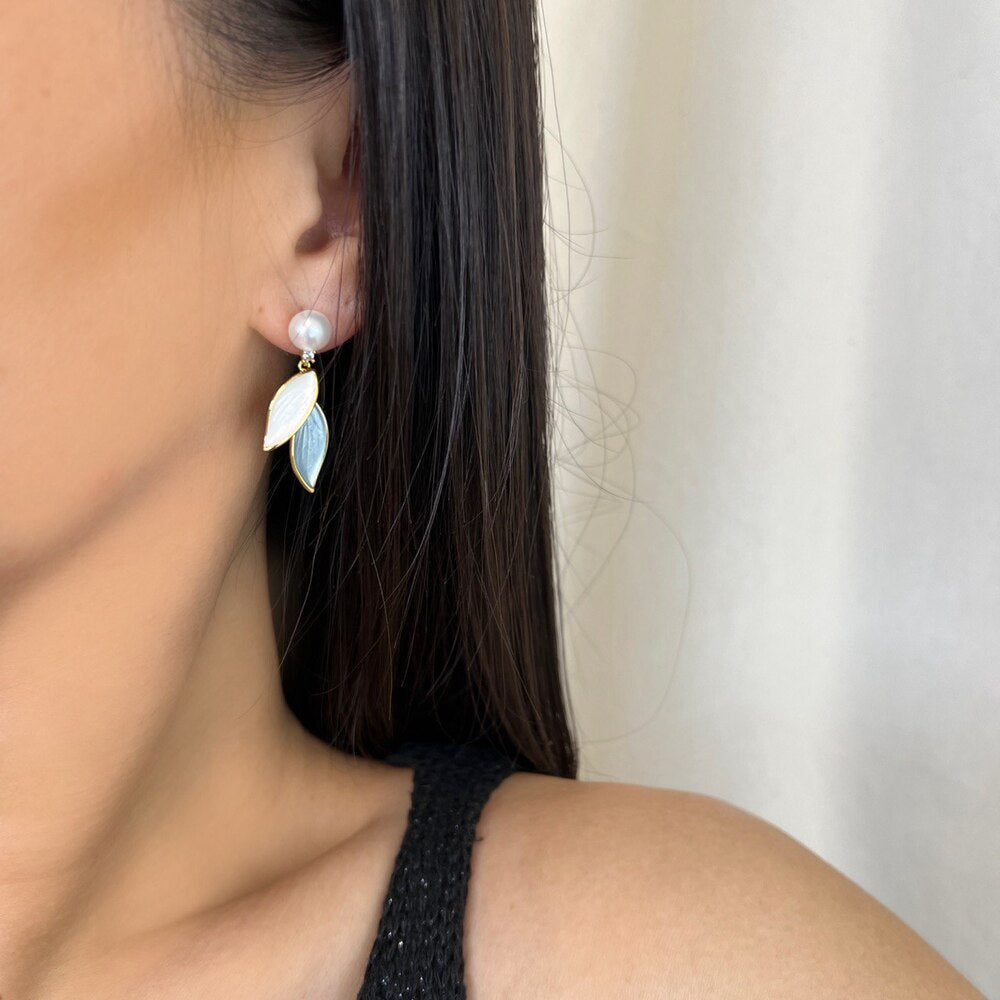Σκουλαρίκια ορείχαλκου με μαργαριτάρια, κρεμαστά, επιχρυσωμένα με 14k. Το σχέδιό τους, φύλλα σε γαλάζιο και λευκό σε συνδυασμό με την λάμψη των μαργαριταριών δίνουν μια ρομαντική και σικάτη αίσθηση.