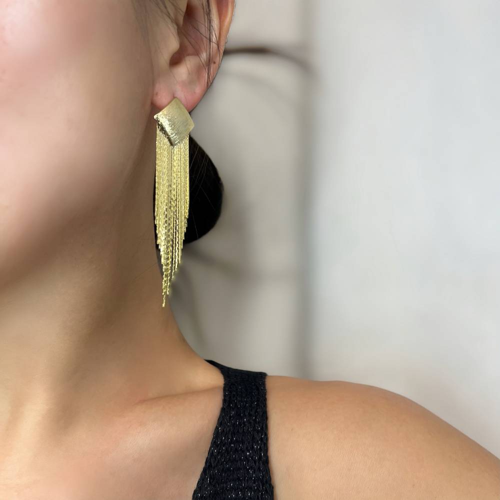 Εντυπωσιακό ζευγάρι σκουλαρίκια με κρόσσια που συνδυάζει τη λάμψη με την εκκεντρικότητα που όλες έχουμε ανάγκη. Η ζεστή απόχρωση του χρυσού ταιριάζει σε όλες τις επιδερμίδες, ήρθε η ώρα να τολμήσουμε!