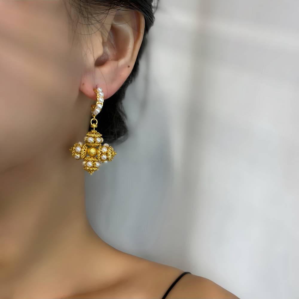Ορειχάλκινα επιχρυσωμένα με 18Κ, σκουλαρίκια σε σχήμα σταυρού με μαργαριτάρια που αναβαθμίζουν κάθε εμφάνιση με τη λάμψη τους και το στιλ τους. Τα σκουλαρίκια αυτά θα αναδείξουν το outfit σας και θα σας κάνουν να ξεχωρίζετε.