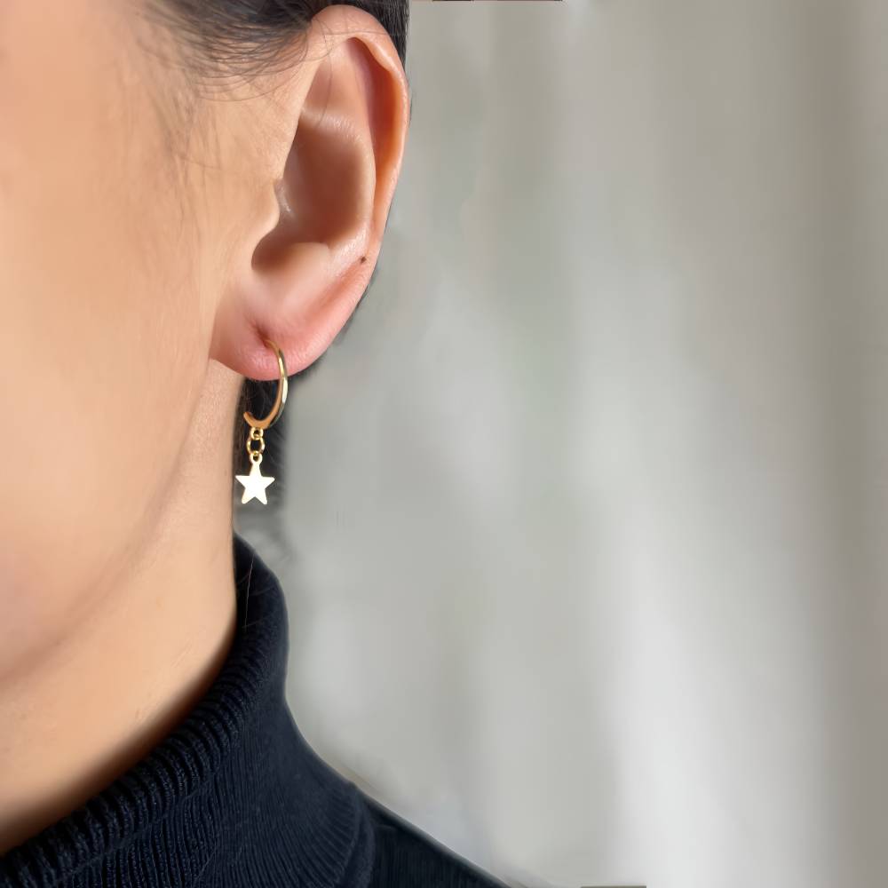 Ασημένια σκουλαρίκια, επιχρυσωμένα, με κρεμαστό σχέδιο αστεράκι που προσδίδουν την ιδανική λάμψη σε κάθε εμφάνιση. Ιδανικά για τους πιο απίθανους συνδυασμούς ear combo. Μπορούν να συνδυαστούν με άλλα κοσμήματα για πιο λαμπερές εμφανίσεις.