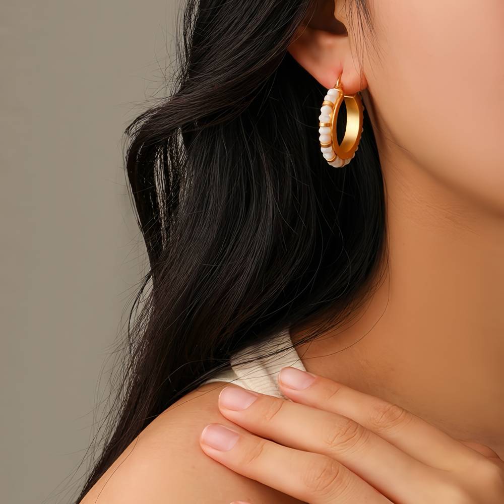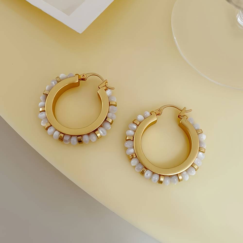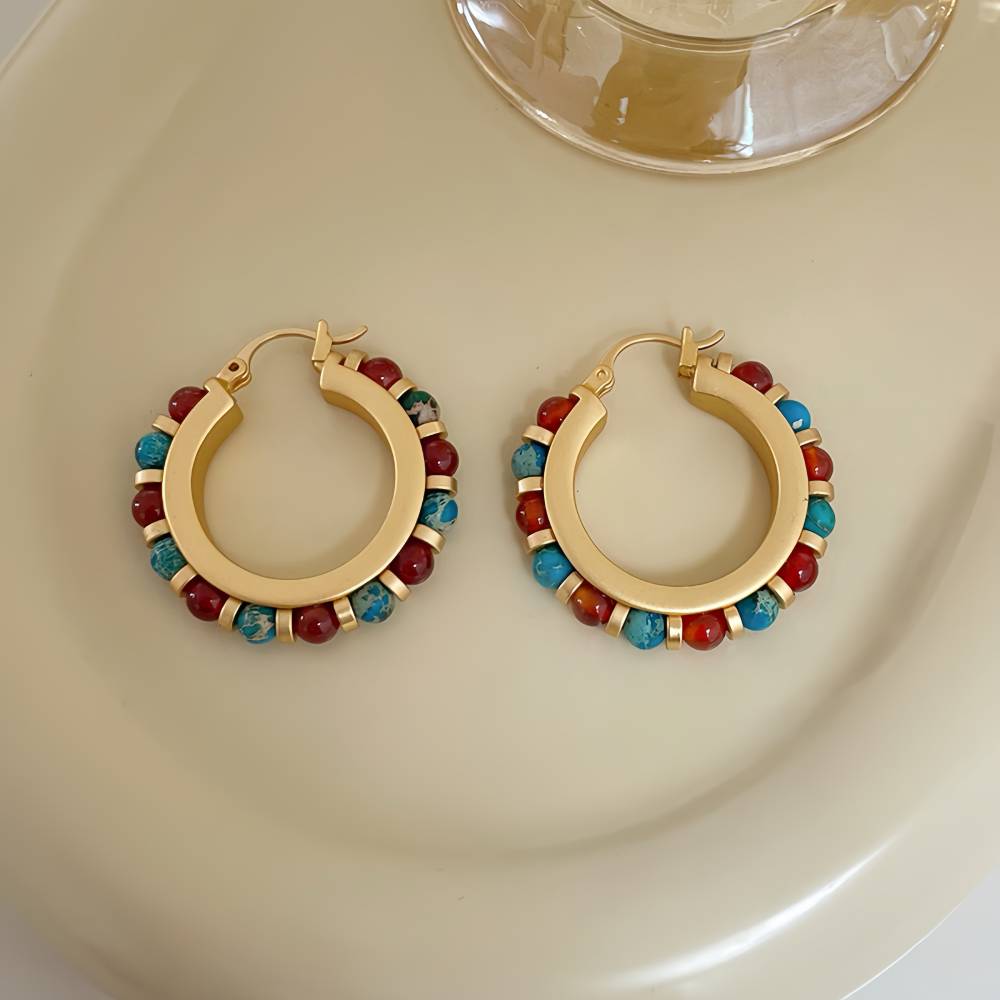 Σκουλαρίκια κρίκοι από επιχρυσωμένο ορείχαλκο διακοσμημένο με χάντρες από φυσική πέτρα. Δίνουν μία boho αίσθηση στο look σας. Φοριούνται άνετα από το πρωί έως το βράδυ.