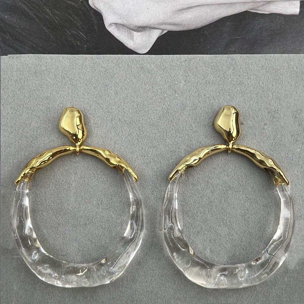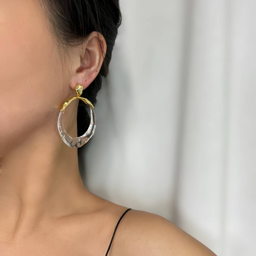 Κατασκευασμένο από ορείχαλκο, ένα εντυπωσιακό ζευγάρι κρεμαστοί κρίκοι με περίτεχνο και ρητίνη στο σχέδιο τους. Συνοδεύουν όλα σας τα outfit και σας αναδεικνύουν με τη λάμψη τους.