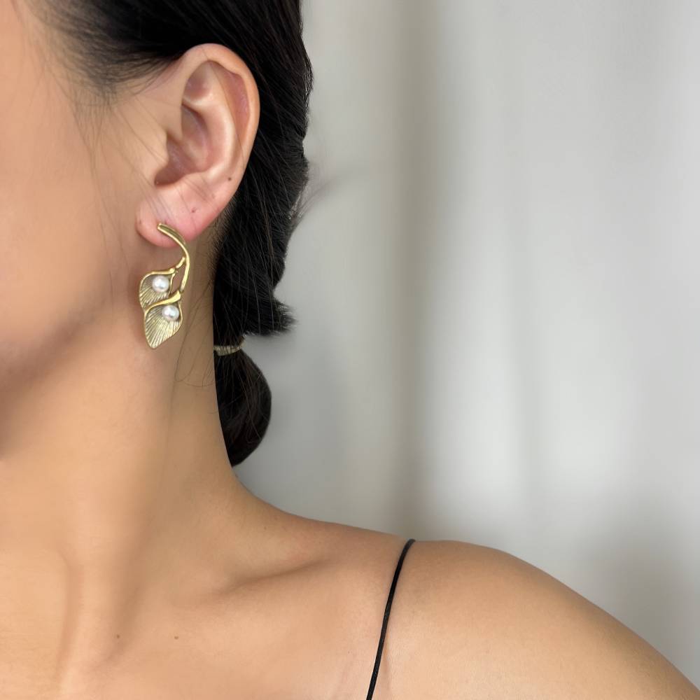 Ντελικάτο ζευγάρι σκουλαρίκια με σχήμα φύλλων. Καλαίσθητο σχέδιο με μια ιδιαίτερη πινελιά, τα μαργαριτάρια που του προσδίδουν κομψότητα.