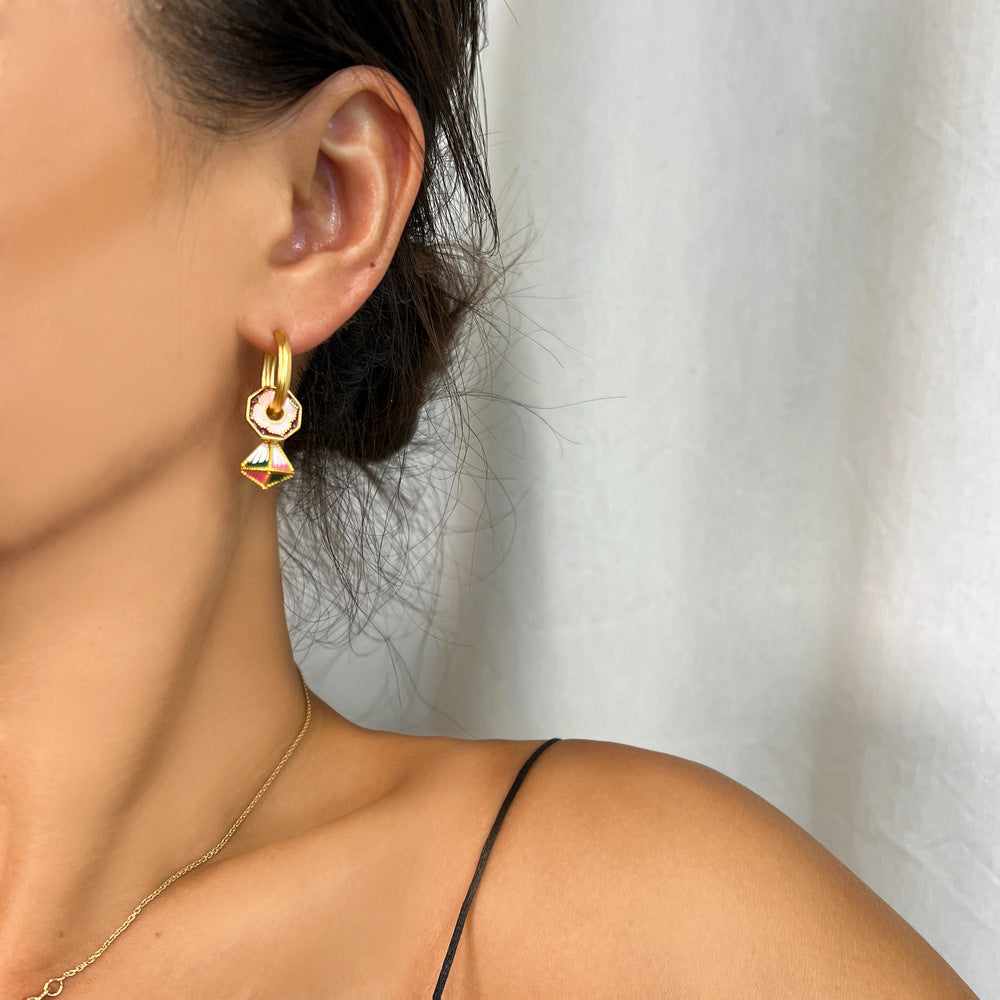Εκπληκτικό ζευγάρι απο ορείχαλκο επιχρυσωμένο διακοσμημένα με σμάλτο σε όμορφα χρώματα. Ένα κομψό ζευγάρι σκουλαρίκια που μπορεί να φορεθεί όλες τις ώρες και να αναδείξει αρμονικά το outfit σας.
