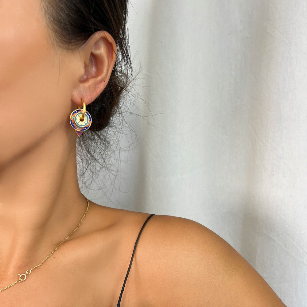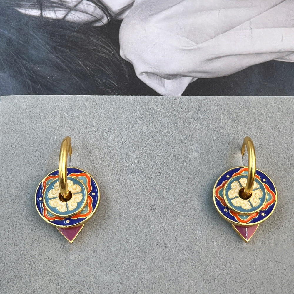 Εκπληκτικό ζευγάρι απο ορείχαλκο επιχρυσωμένο διακοσμημένα με σμάλτο σε όμορφα χρώματα. Ένα κομψό ζευγάρι σκουλαρίκια που μπορεί να φορεθεί όλες τις ώρες και να αναδείξει αρμονικά το outfit σας.