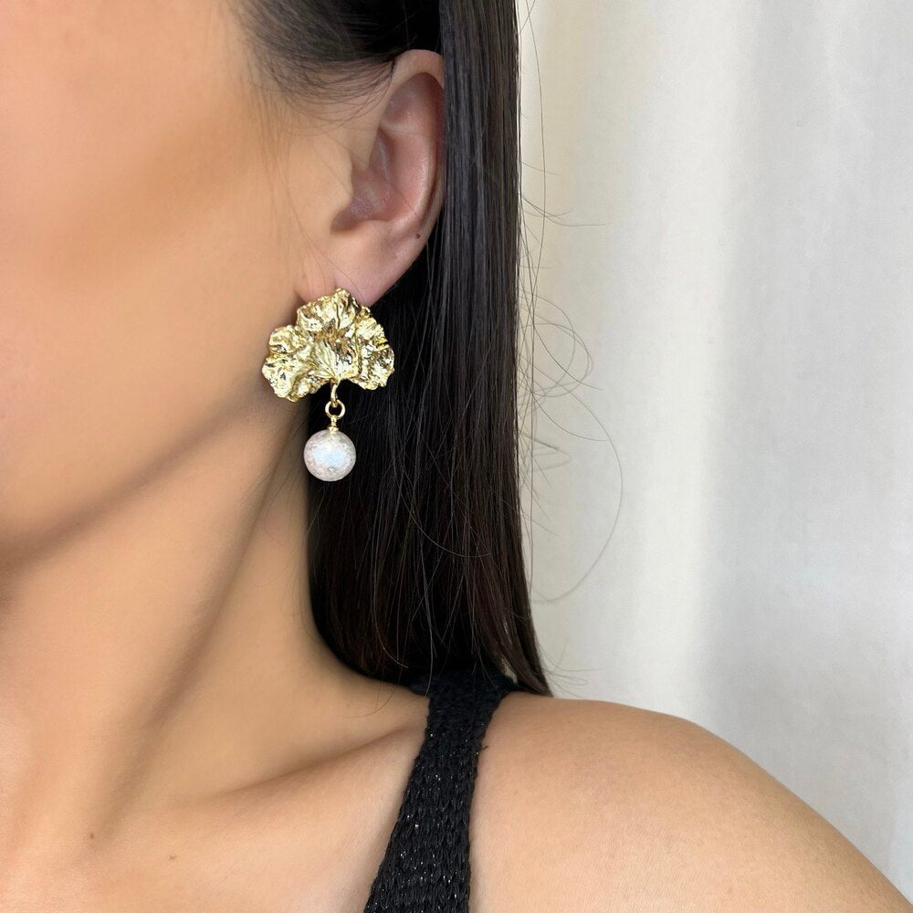 Φίνο κόσμημα σε σχήμα φύλλου με κρεμαστό μαργαριτάρι. Συνοδεύει με κομψότητα την κάθε σας εμφάνιση.