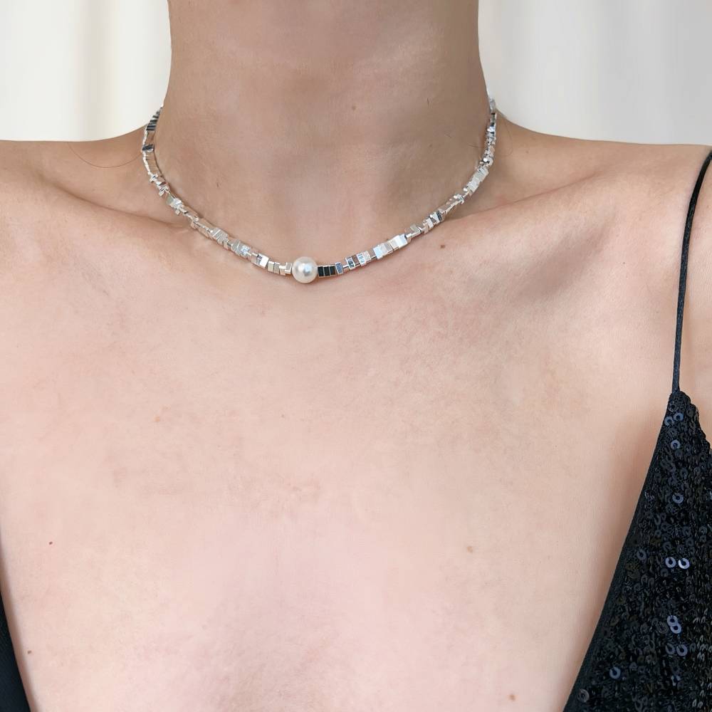 Κολιέ ασημένιο με mini cubes και μαργαριτάρι στο κέντρο του. Φοριέται από το πρωί έως το βράδυ και αναδεικνύει υπέροχα όλα σας τα outfit. Μια πινελιά ομορφιάς για να συμπληρώσει την εμφάνιση σας.