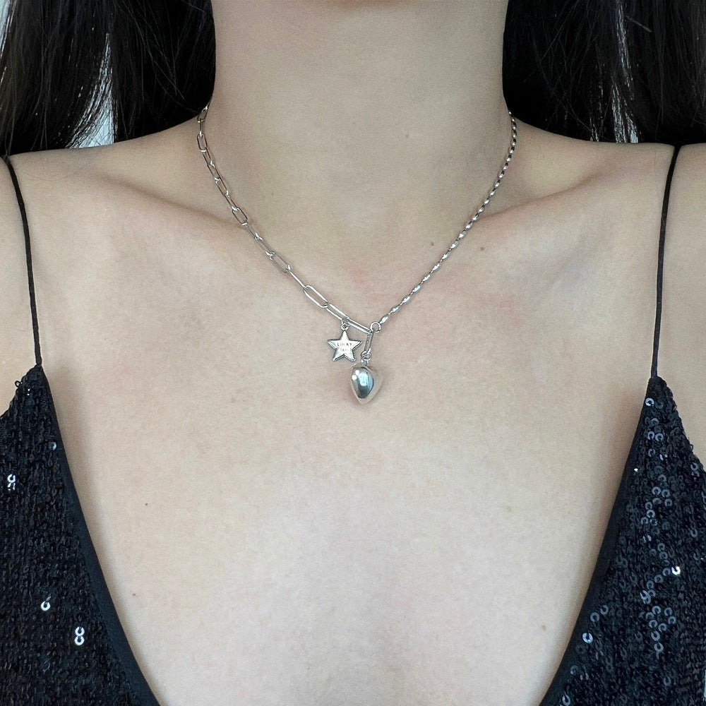 Μοντέρνο ασημένιο κολιέ διακοσμημένο με καρδιά και αστέρι, αποτελείται από δυο στυλ αλυσίδας που το κάνουν ξεχωριστό. Ένα εκπληκτικό κόσμημα για να τελειοποιήσετε το outfit σας.