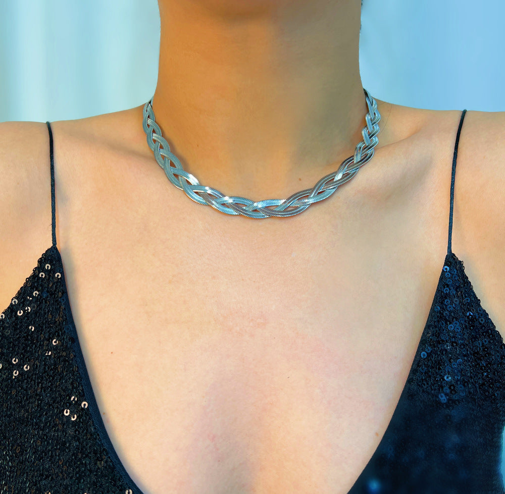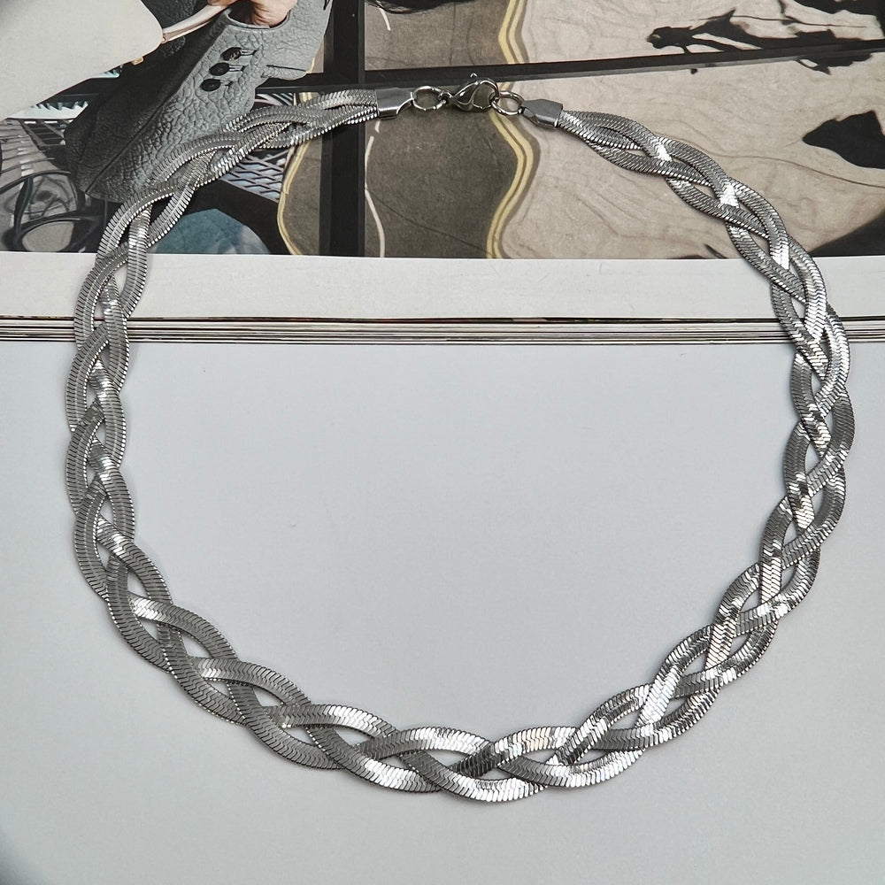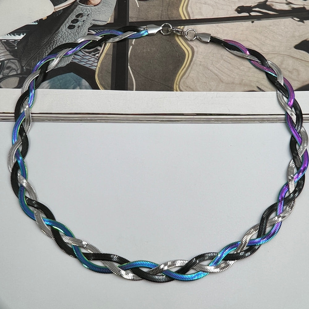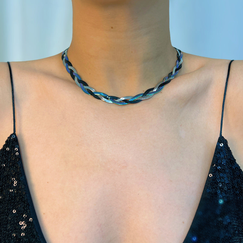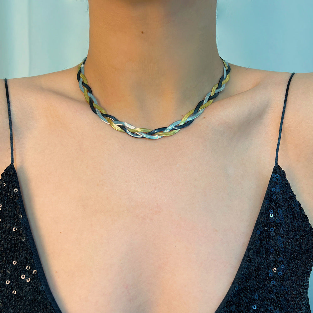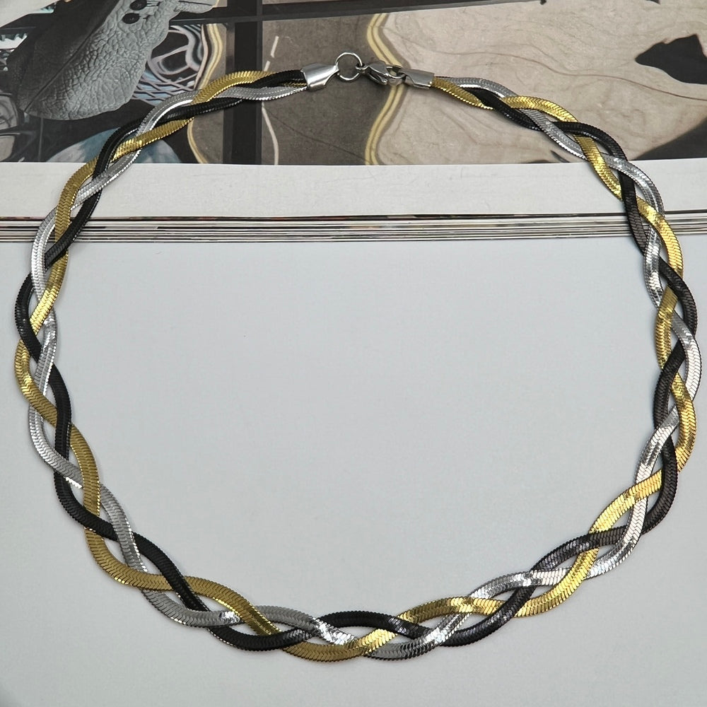 Κολιέ από ατσάλι σε σχήμα πλεξούδας και τρεις αποχρώσεις. Ένα κόσμημα που τραβάει τα βλέμματα . Δίνει στυλ στην εμφάνισή σας.