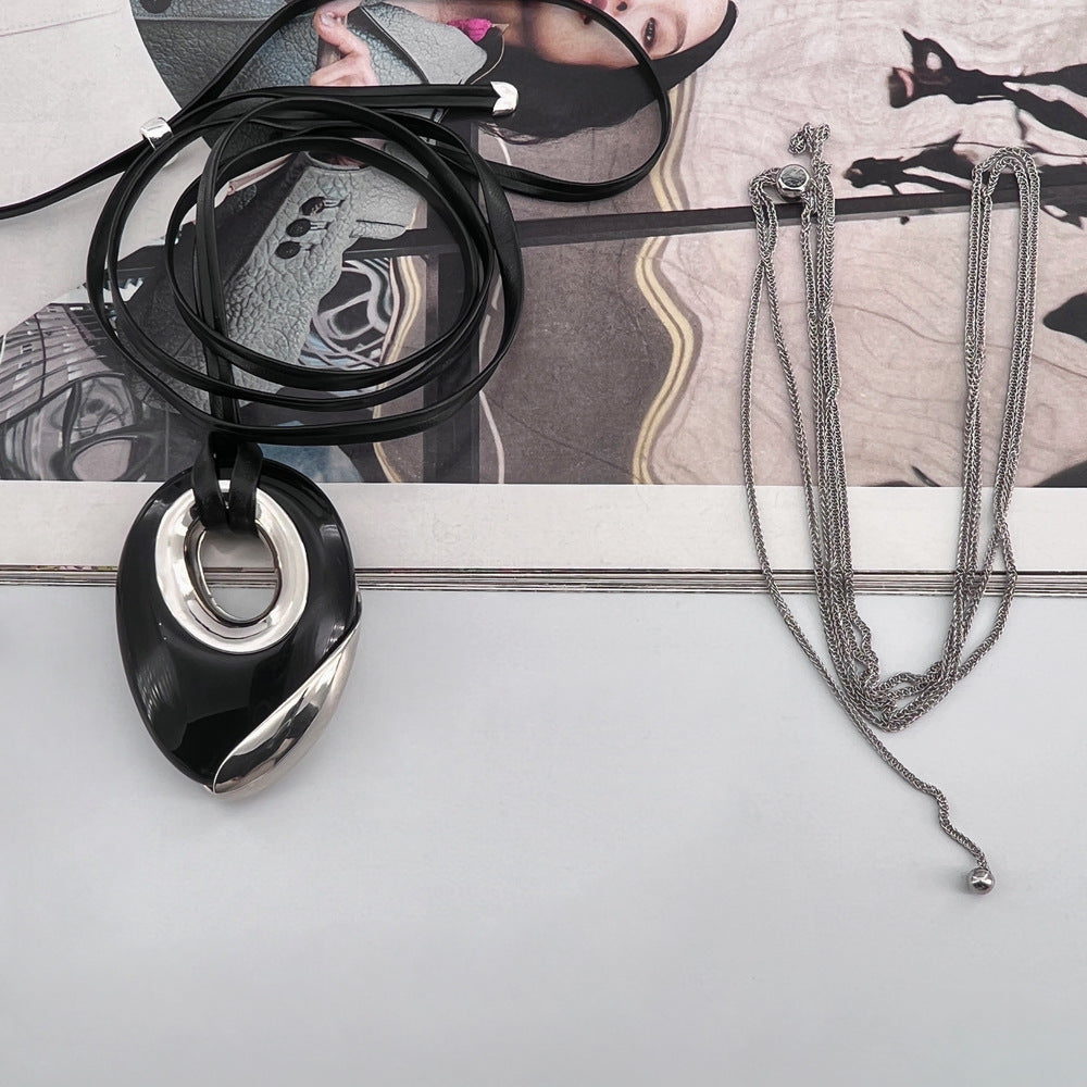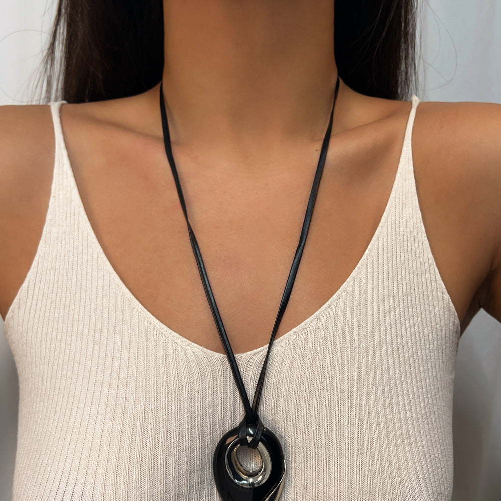 Κολιέ με κρεμαστό. Εξαιρετικό κολιέ που θα αναδείξει περίφημα τα outfit σας με μια πινελία κομψότητας. Αποτελείτε απο δύο διαφορετικά λουράκια ασημί και μαύρο για διαφορετικές εμφανίσεις.