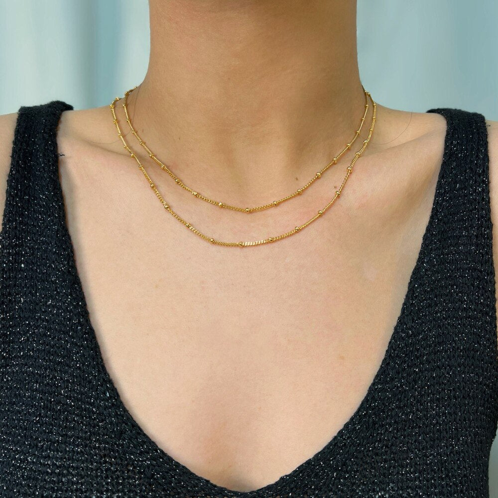 Κολιέ για όλες τις περιστάσεις φοριέται από το πρωί στο γραφείο έως το βράδυ στην έξοδό σας. Αποτελείται από δύο αλυσίδες διακοσμημένες με μπίλιες από επιχρυσωμένο ορείχαλκο. Με την απλότητα του αναδεικνύει τις εμφανίσεις σας και μπορεί άνετα να συνδυαστεί με άλλα κοσμήματα.