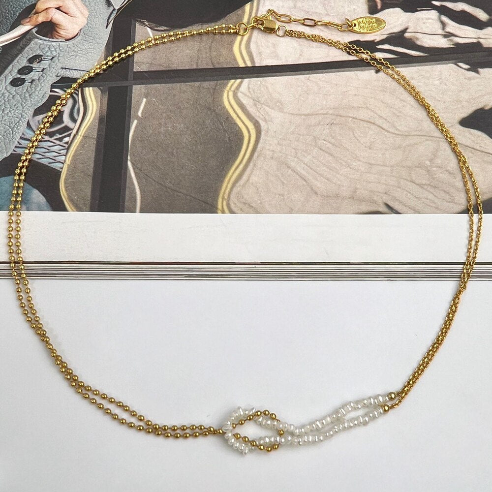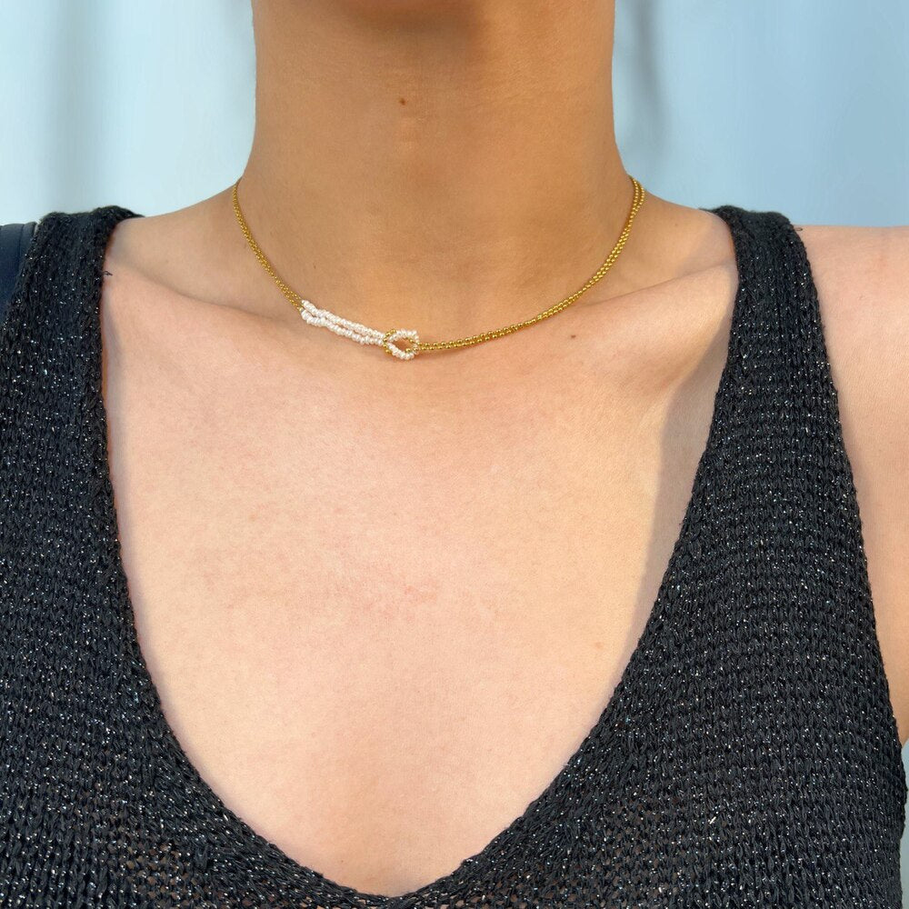 Όμορφο κολιέ ορείχαλκου επιχρυσωμένου με μαργαριτάρια σε δέσιμο κόμπου. Ιδανικό για να αναδείξει τις καθημερινές σας εμφανίσεις.