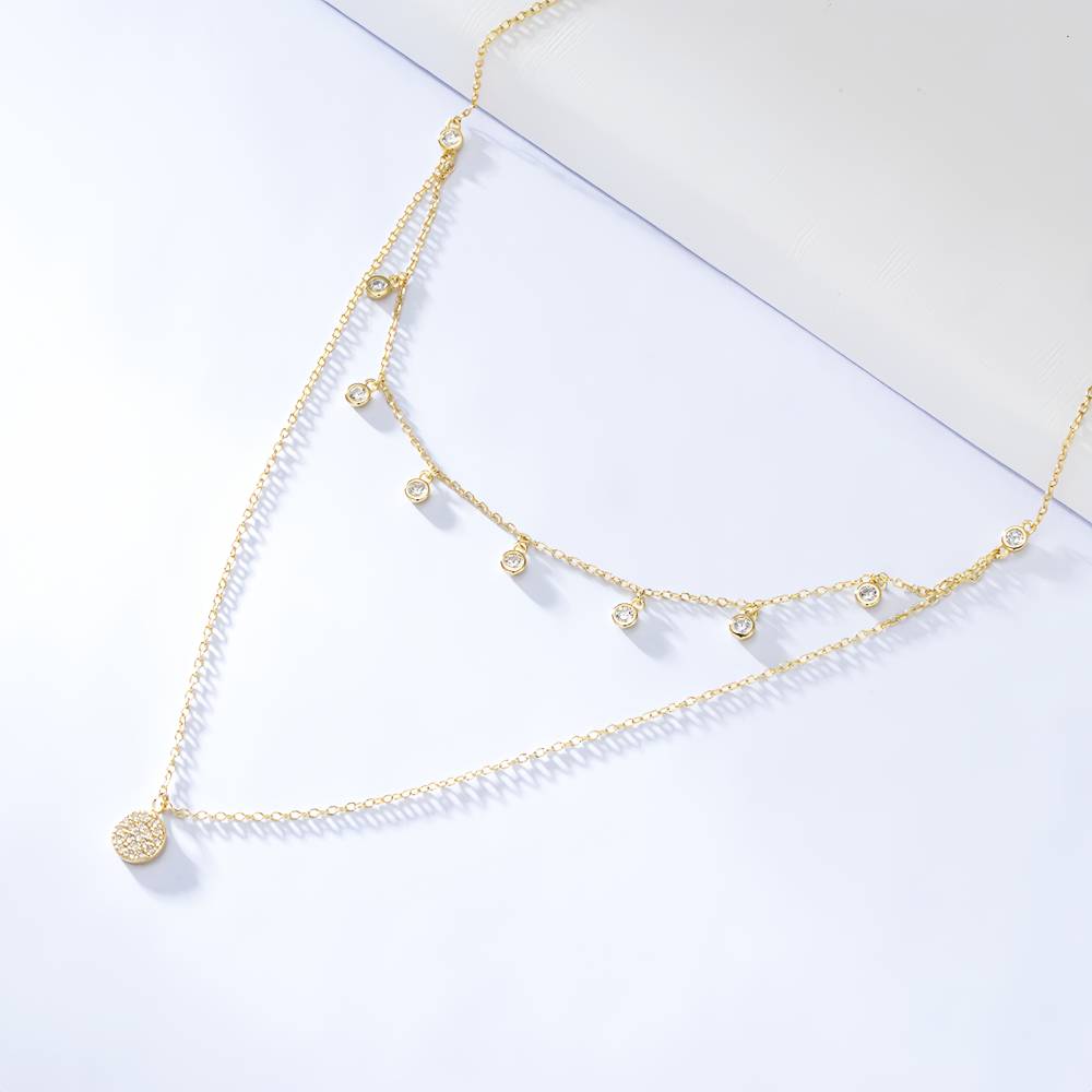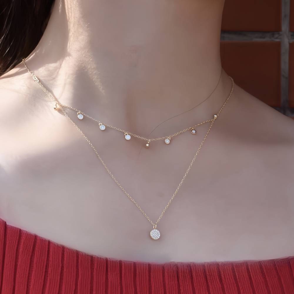 Πανέμορφο κολιέ με διπλή αλυσίδα ,την μια κοσμούν μια σειρά από ζιργκόν και το κέντρο του κοσμεί ένα μενταγιόν από μικρές πέτρες ζιργκόν. Κοσμεί το λαιμό σας διακριτικά. Μπορεί να συνδυαστεί και με άλλα κοσμήματα.
