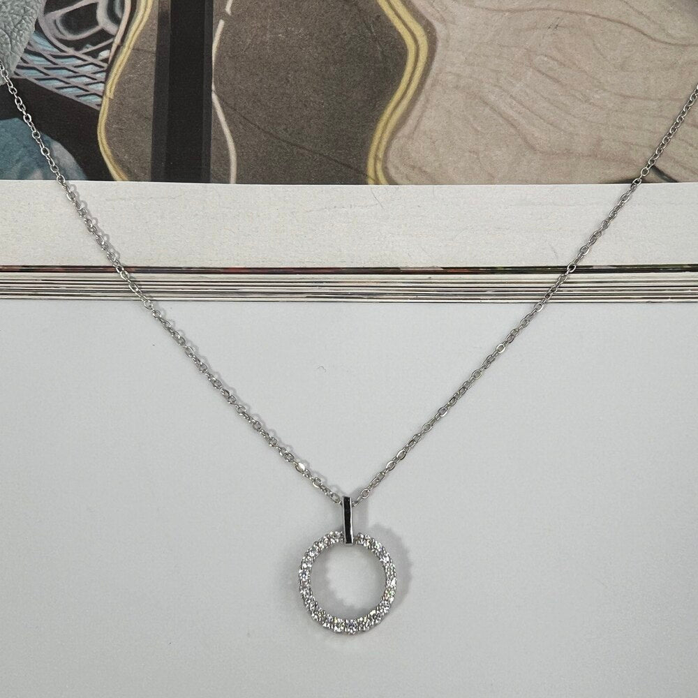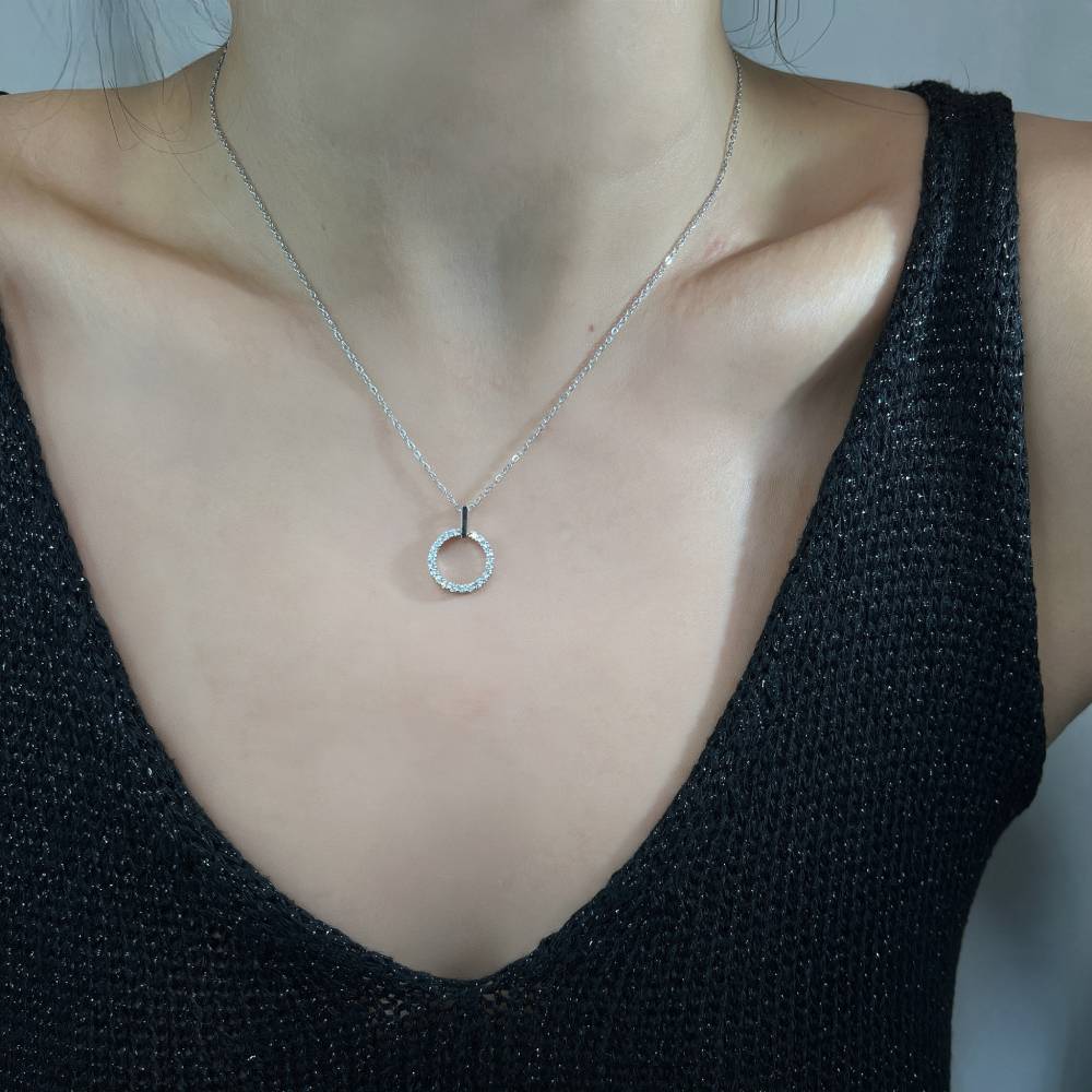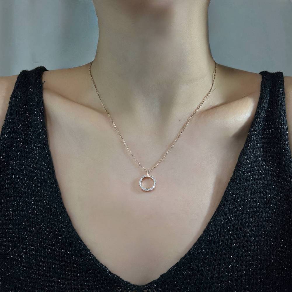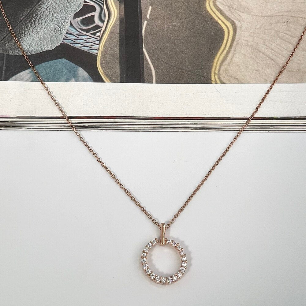 Κολιέ για όλες τις περιστάσεις φοριέται από το πρωί στο γραφείο έως το βράδυ στην έξοδό σας. Το σχήμα του μενταγιόν είναι στρογγυλό και αποτελείτε από ζιργκόν τα οποία συνδυάζονται αρμονικά με τον επιχρυσωμένο ορείχαλκο. Διαθέσιμο σε δύο  αποχρώσεις ασημί και ροζ χρυσό.