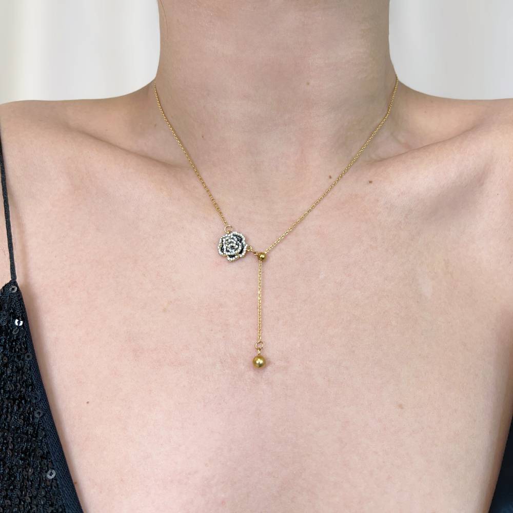 Ατσάλινο κολιέ με ένα τριαντάφυλλο στο κέντρο του, το οποίο είναι διακοσμημένο με πολλά ζιργκόν για extra λάμψη. Ένα κολιέ με φινέτσα για να συνοδεύσει όλες σας τις εμφανίσεις. Συνδυάζετε όμορφα με τα σκουλαρίκια της ίδιας συλλογής.