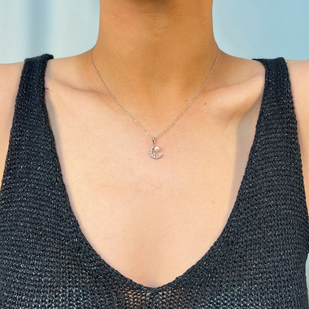 Ασημένιο κολιέ επιχρυσωμένο με κρεμαστό φεγγάρι διακοσμημένο με ζιργκόν που του δίνουν λάμψη και μια πέρλα μαργαριταριού του χαρίζει επιπλέον κομψότητα .