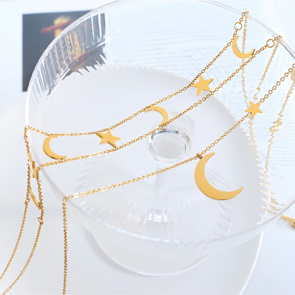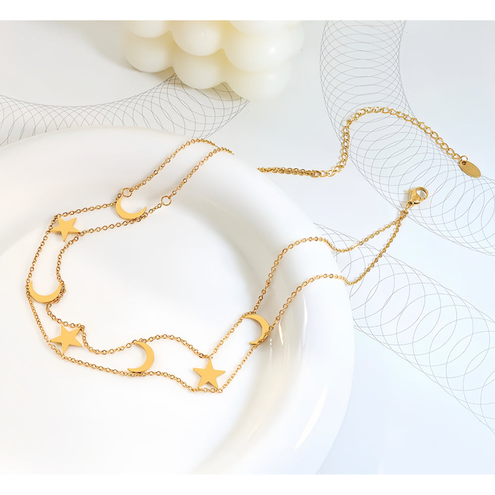 Εντυπωσιακό διπλό κολιέ με σχέδια φεγγάρι και αστέρια. Μπορείτε να φορέσετε και την κάθε αλυσίδα μεμονωμένα αλλά και μαζί.