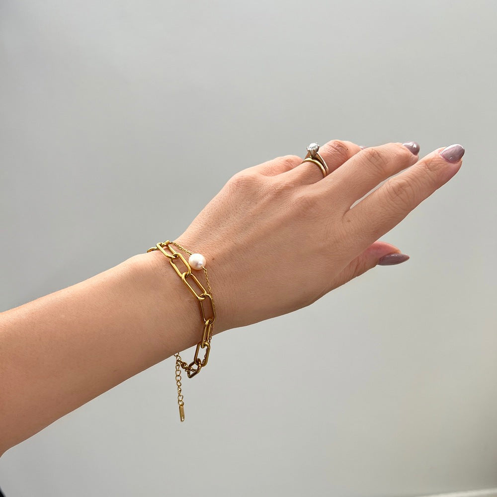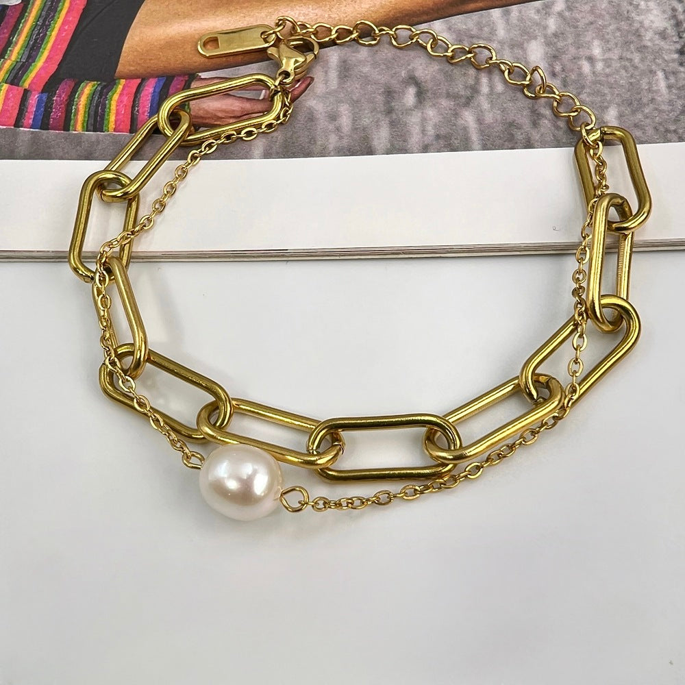 Βραχιόλι από ατσάλι 316L. Διπλή αλυσίδα με μαργαριτάρι, που συνδυάζεται πολύ όμορφα με άλλα κοσμήματα.