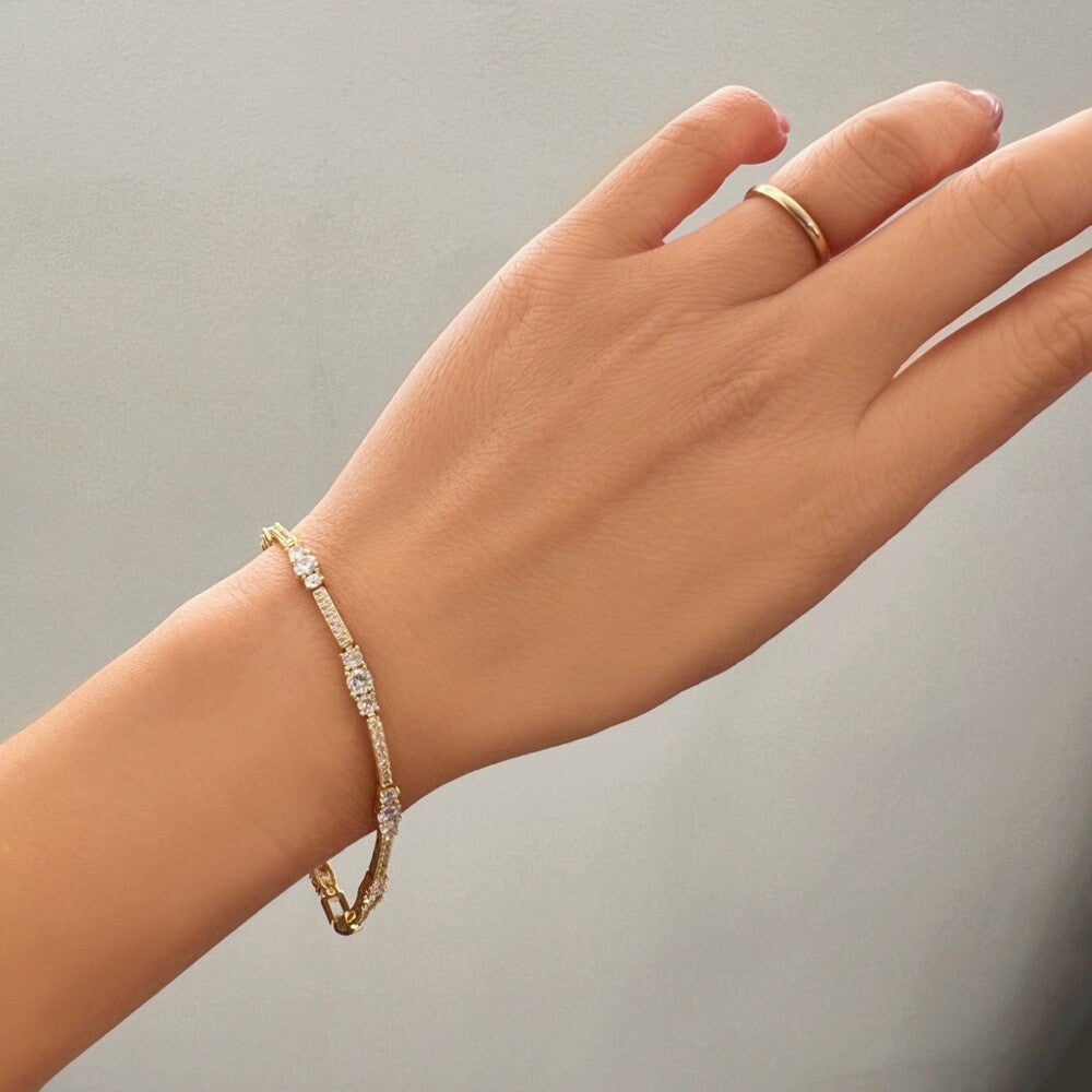 Βραχιόλι από ατσάλι 316L επιχρυσωμένο με ζιργκόν που του προσδίδουν λάμψη και κομψότητα.