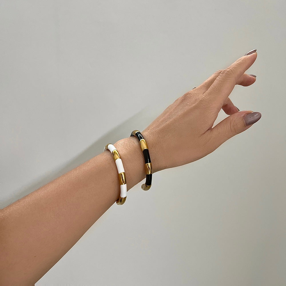 Βραχιόλι χειροπέδα από ατσάλι 316L με σμάλτο. Το ιδιαίτερο σχεδιό του προσδίδει κομψότητα και μπορεί να φορεθεί με άνεση σε κάθε περίσταση.