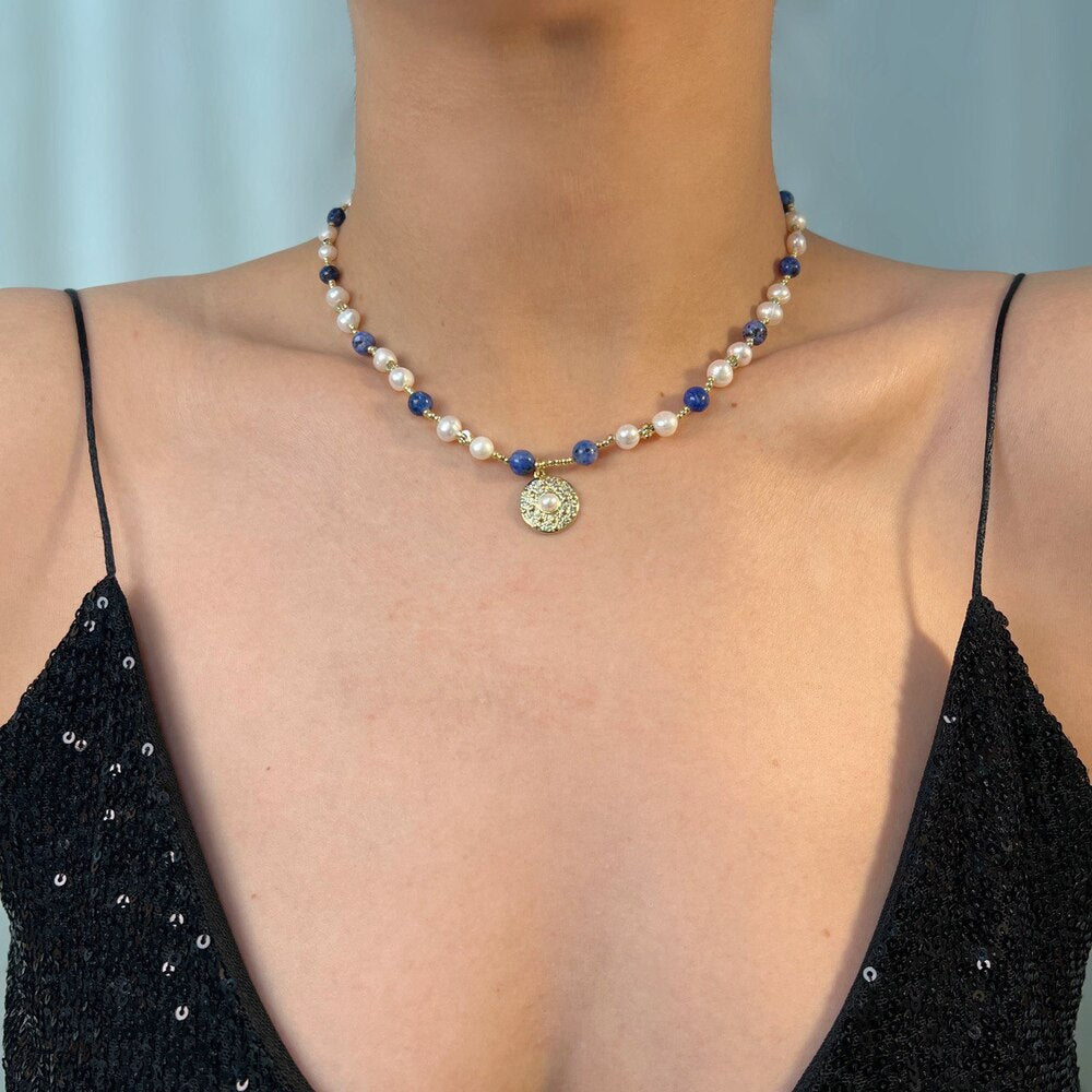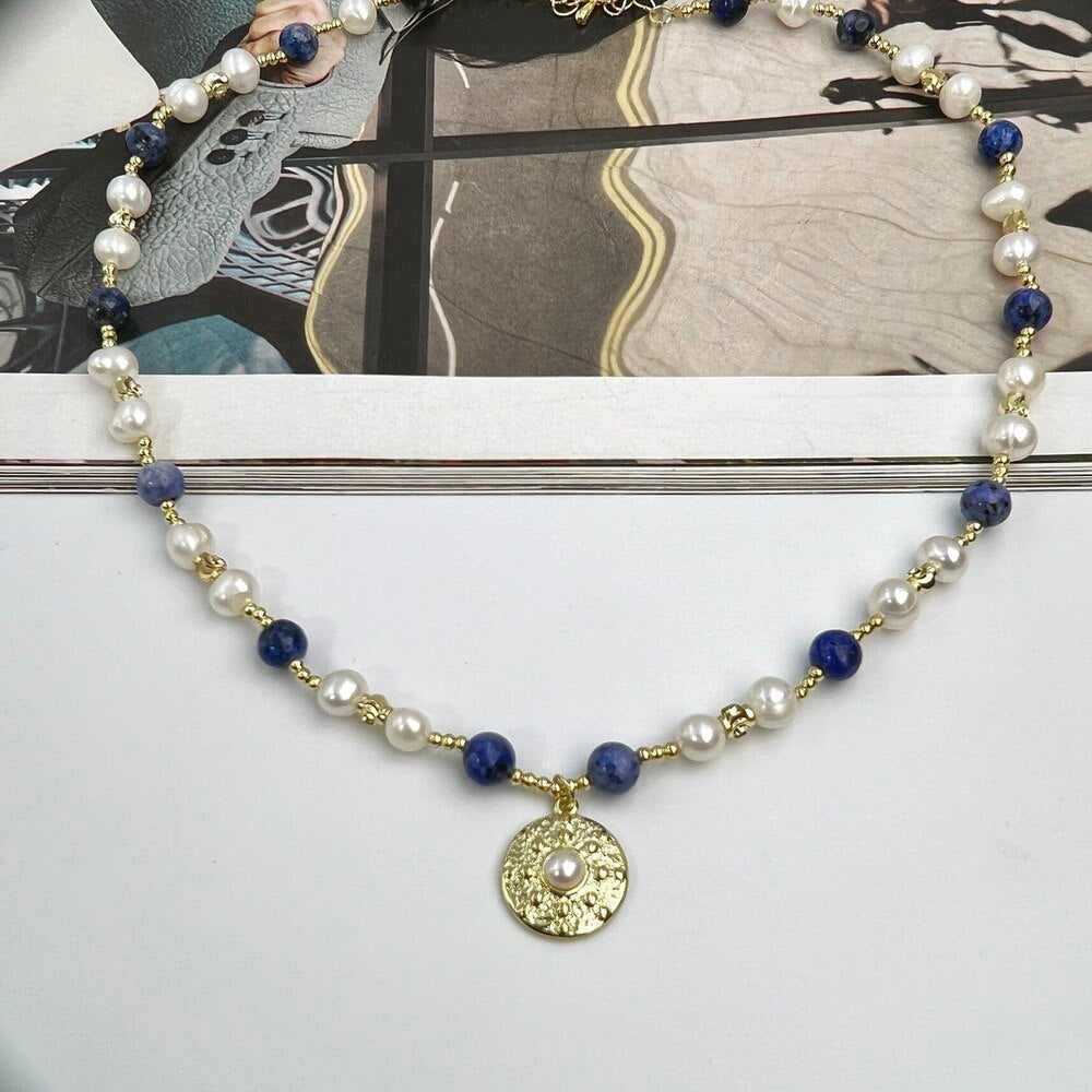 Κολιέ γυναικείο από ατσάλι επιχρυσωμένο. Είναι διακοσμημένο με μαργαριτάρια και φυσική πέτρα σε μπλε χρώμα. Εξαιρετικό κολιέ με ατσάλινο σφυρήλατο μενταγιόν στο κέντρο του.