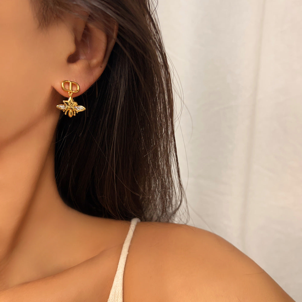 Ένα υπέροχο ζευγάρι κρεμαστά σκουλαρίκια με ζιργκόν για λάμψη. Το ιδιαίτερο σχέδιο μέλισσας το κάνει εντυπωσιακό.