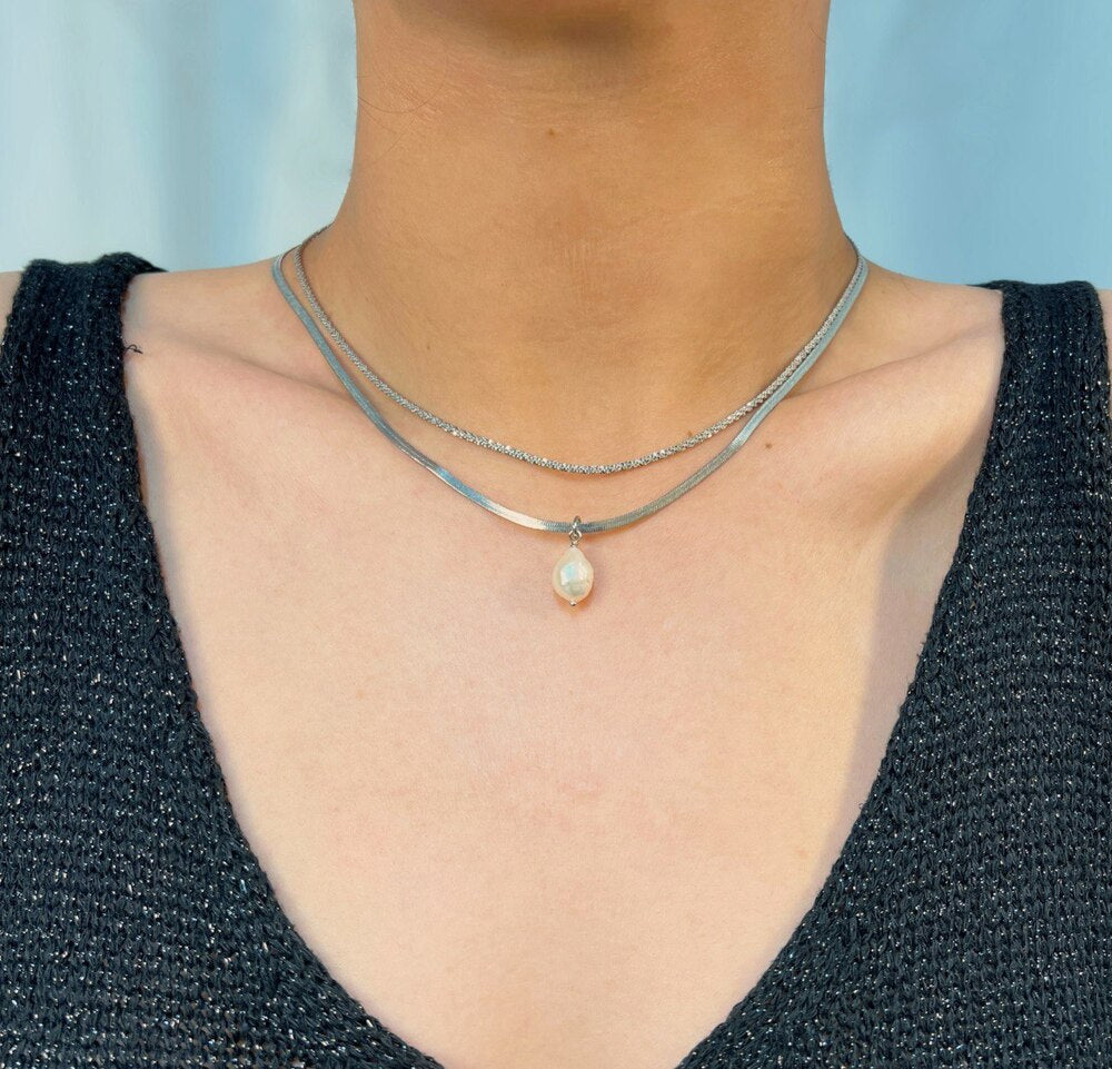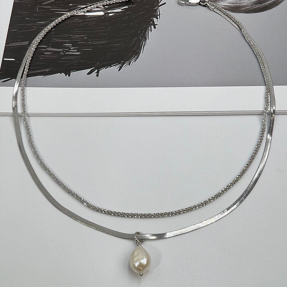 Κολιέ ορείχαλκου επιχρυσωμένου με διπλή αλυσίδα και μαργαριτάρι. Συνδυάζεται όμορφα με βραχιόλι ή δαχτυλίδι με μαργαριτάρι.